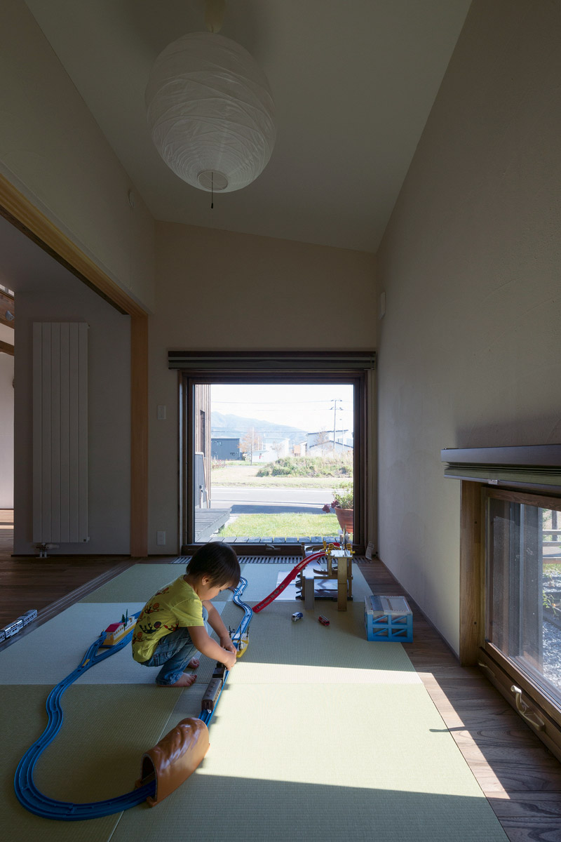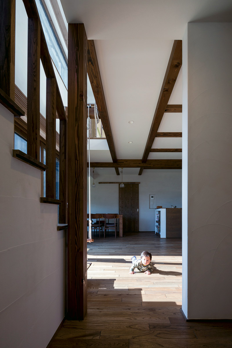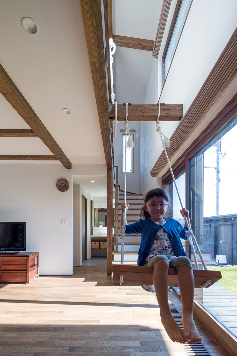 「一番下の子がまだ7ヵ月なので、上の子たちをあまり外に連れていけないんです。でも、庭なら私の目も届くので安心して遊ばせられます」。家の中でもお子さんたちは元気いっぱい。広いリビングを走り回ったり2階で鬼ごっこをしたり。外で遊べない季節のためにと梁を利用してつくったブランコは近所の子どもたちにも人気です。家中が遊びの場となり「この家に引っ越してからテレビを見る時間が減りました」と奥さんは話します。