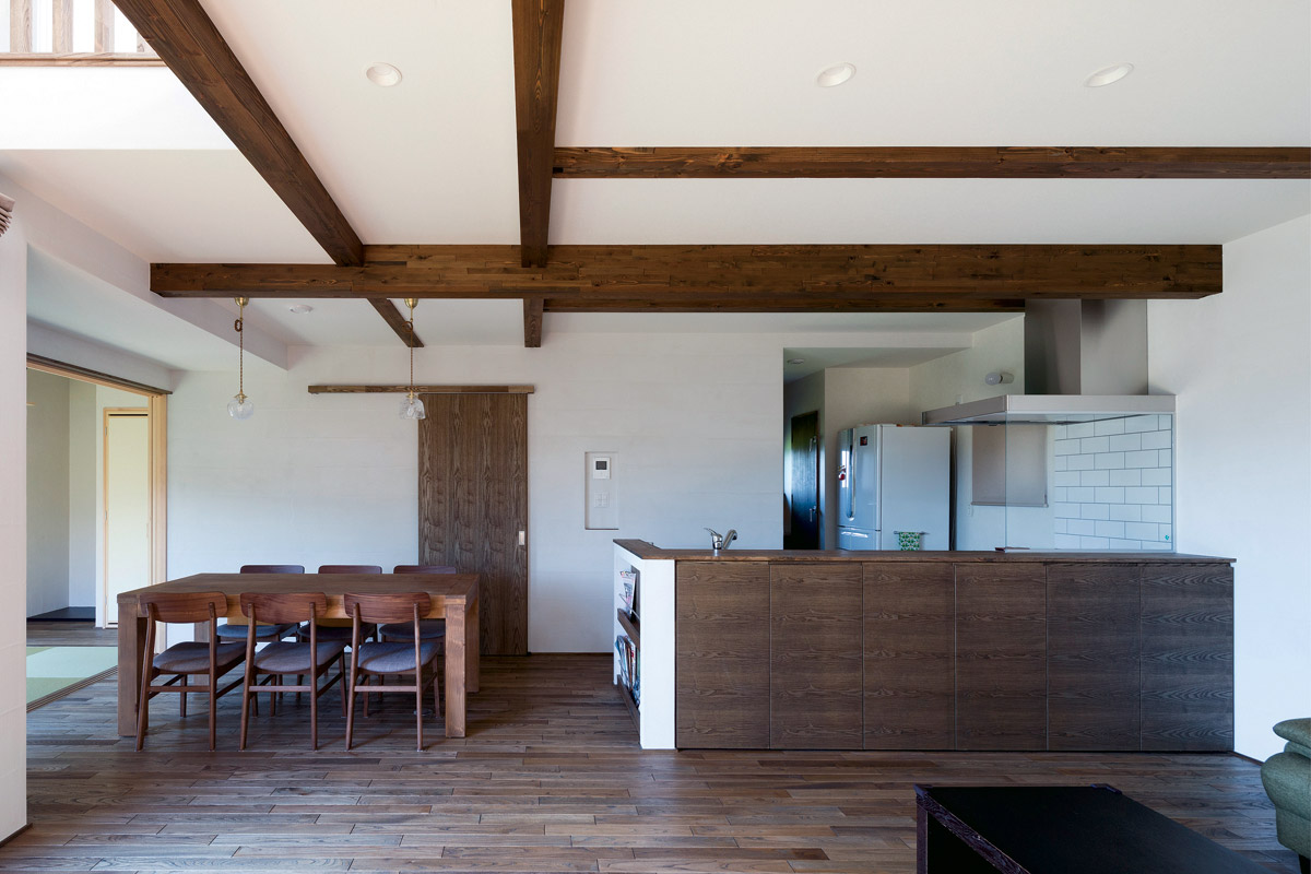 Uさんご夫妻の希望は縁側や和室をつくり、和風のテイストを加えることなど。中でも特に奥さんがこだわったのが対面キッチンでした。お子さんたちが小さいため、家事をしながらでも目が届くようにしたかったそう。結果、完成したキッチンからはリビングのみならず庭まで見通すことができます。これは、広いリビングを実現するため家をL字にしたから。庭を中庭風に囲い、目が届きやすくなったのです。
