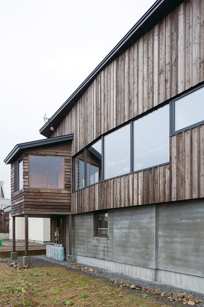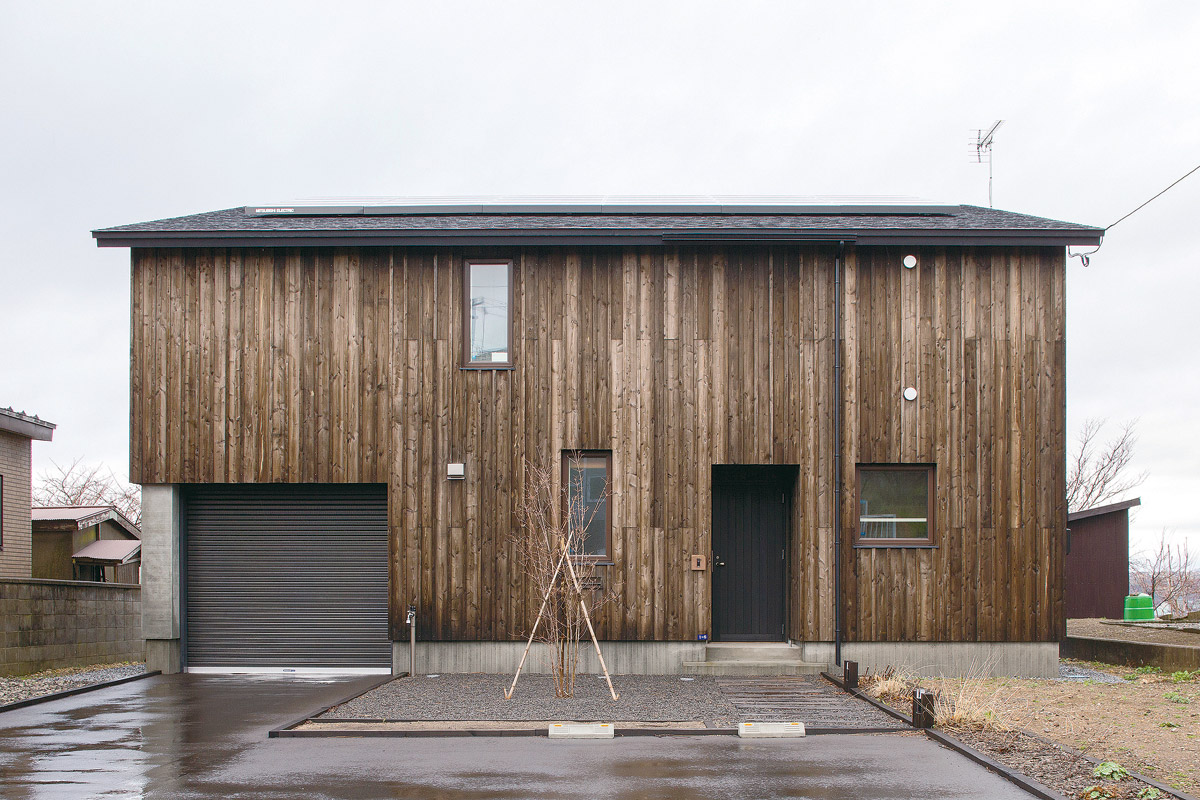 屋根/グラスファイバーシングル、外壁/北海道産カラマツ木酢液含浸板、建具/玄関ドア:木製断熱ドア、窓:木製断熱サッシ 一部樹脂サッシ