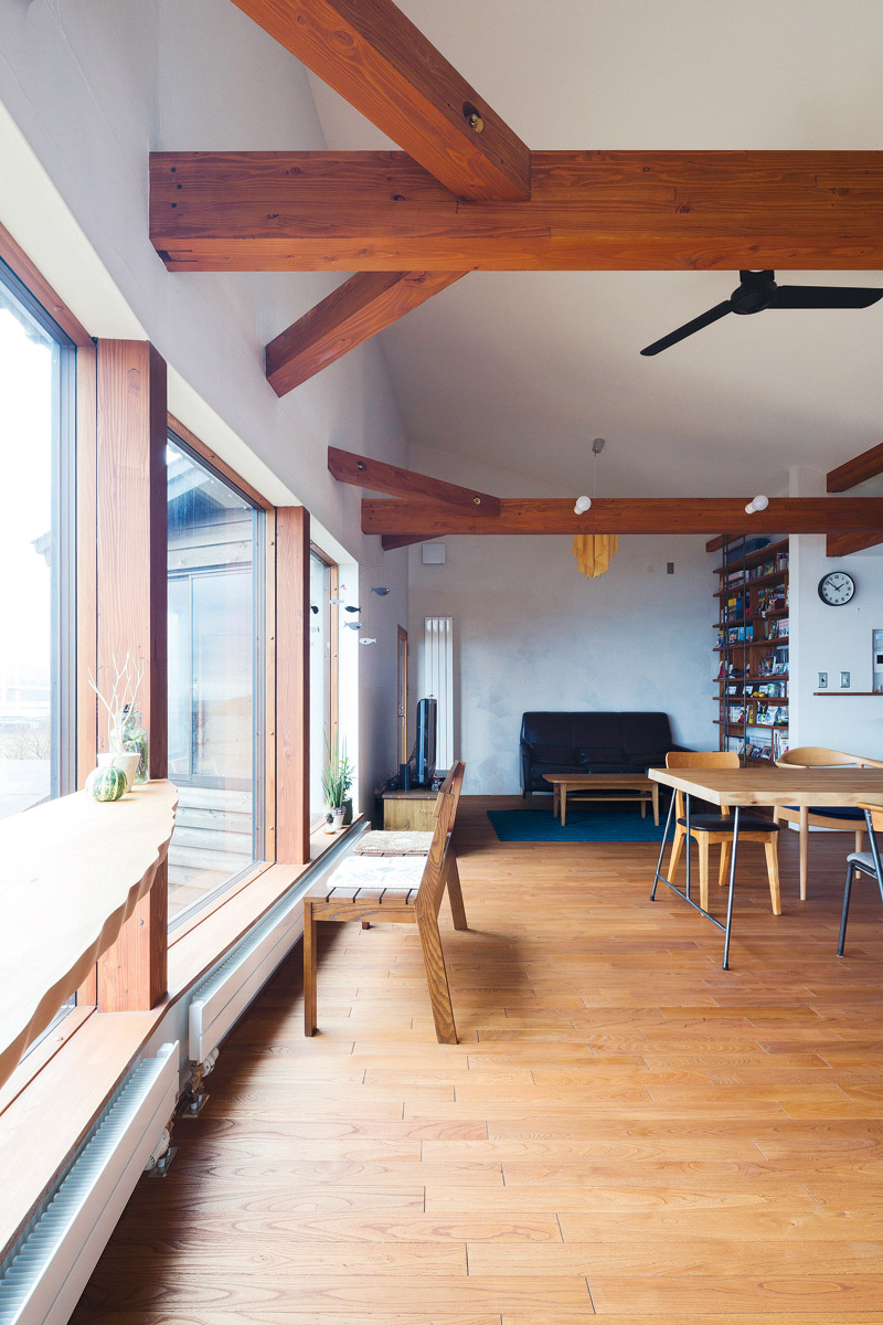 Kさんの機能面でのこだわりは太陽光発電です。遮蔽物が何もないこの環境は自然エネルギーにも最適でした。南に傾斜する屋根に取り付けた6kWのパネルは「生活費になるくらい」の利益を生み、期待以上の働きを見せています。