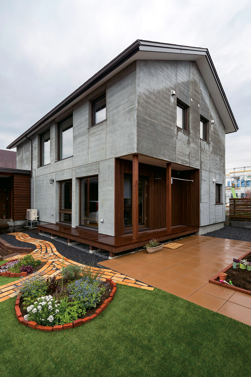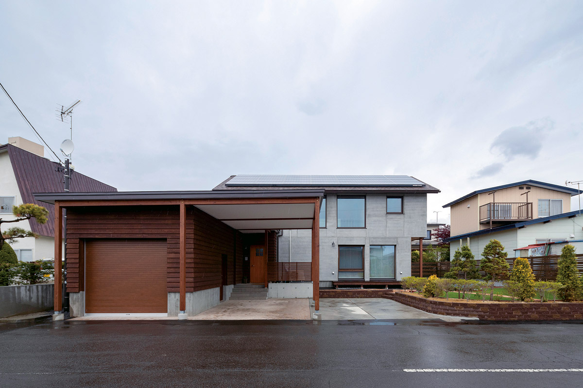 屋根/アスファルトシングル葺、外壁/モルタル掻落し 一部道南スギ板、建具/玄関ドア:木製断熱ドア、窓:木製サッシ・樹脂サッシ