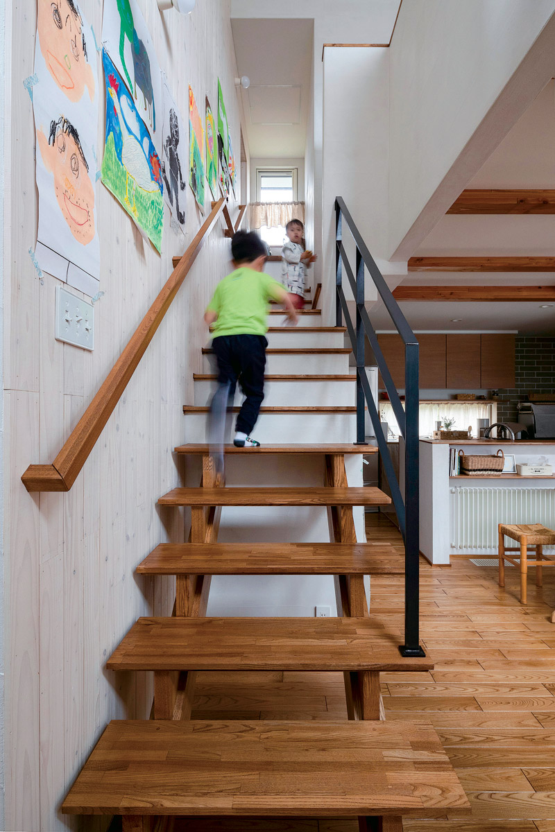 珪藻土入りの塗り壁を基調として、1階から2階への階段横は白く塗ったマツ板で雰囲気を変えています。現在は、子どもたちの絵を貼るギャラリースペースに。がびょうやテープを使用しづらい塗り壁の家の中で、実用面でも存在感を発揮しています。