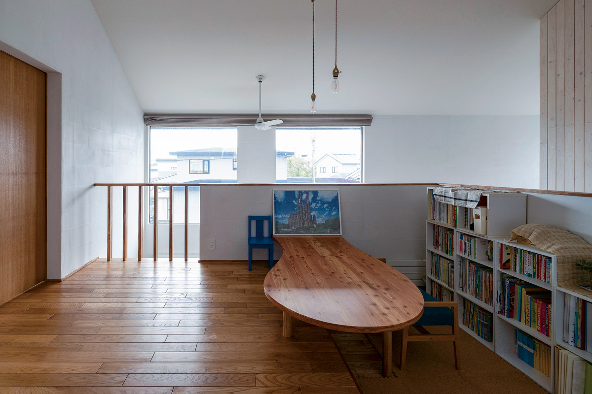 室内に入ると、庭に向けての大開口と高さ6m超の吹き抜けが開放感を与えます。「吹き抜けがあって家が立体的になっているので、子どもたちがどこにいるのかすぐわかるんです」とMさん。この吹き抜けに面して設けられている2階のライブラリーは家族みんなが有効活用している空間。子どもたちの遊び場としてはもちろん、デスクの広さを生かし、アイロンがけやミシンがけの場所としても利用しています。