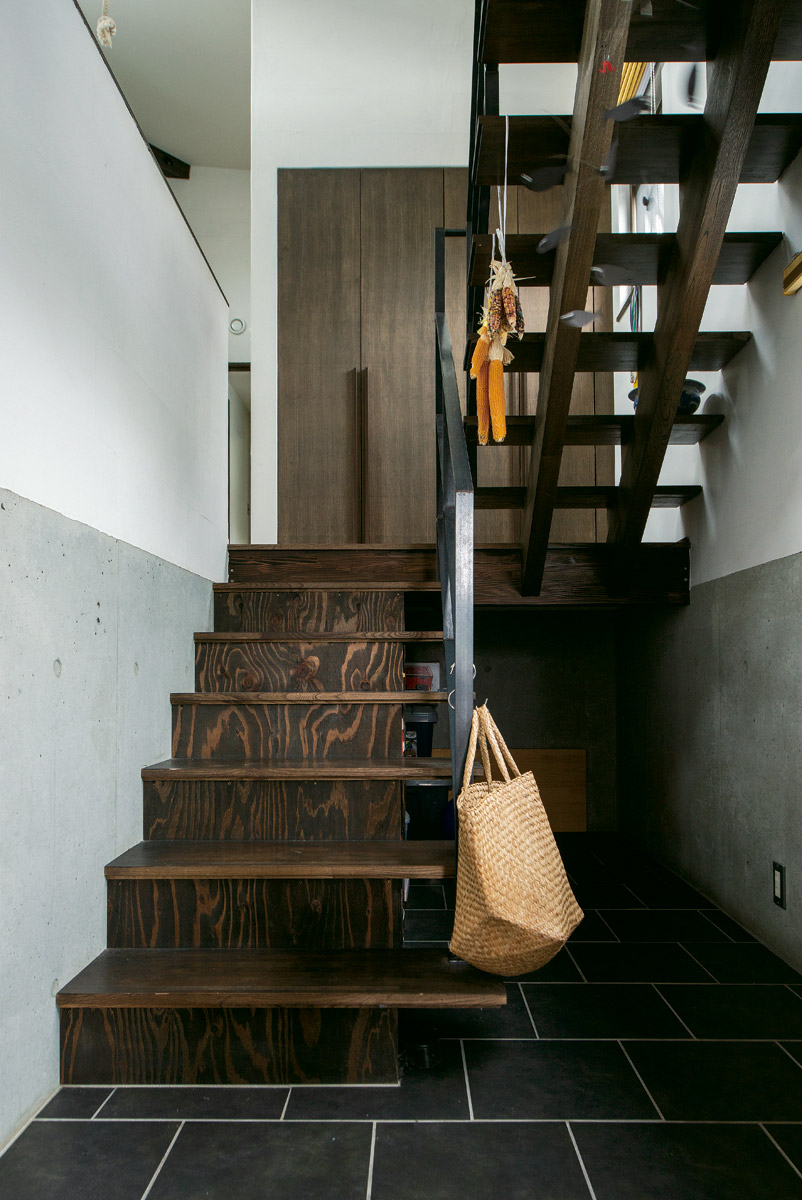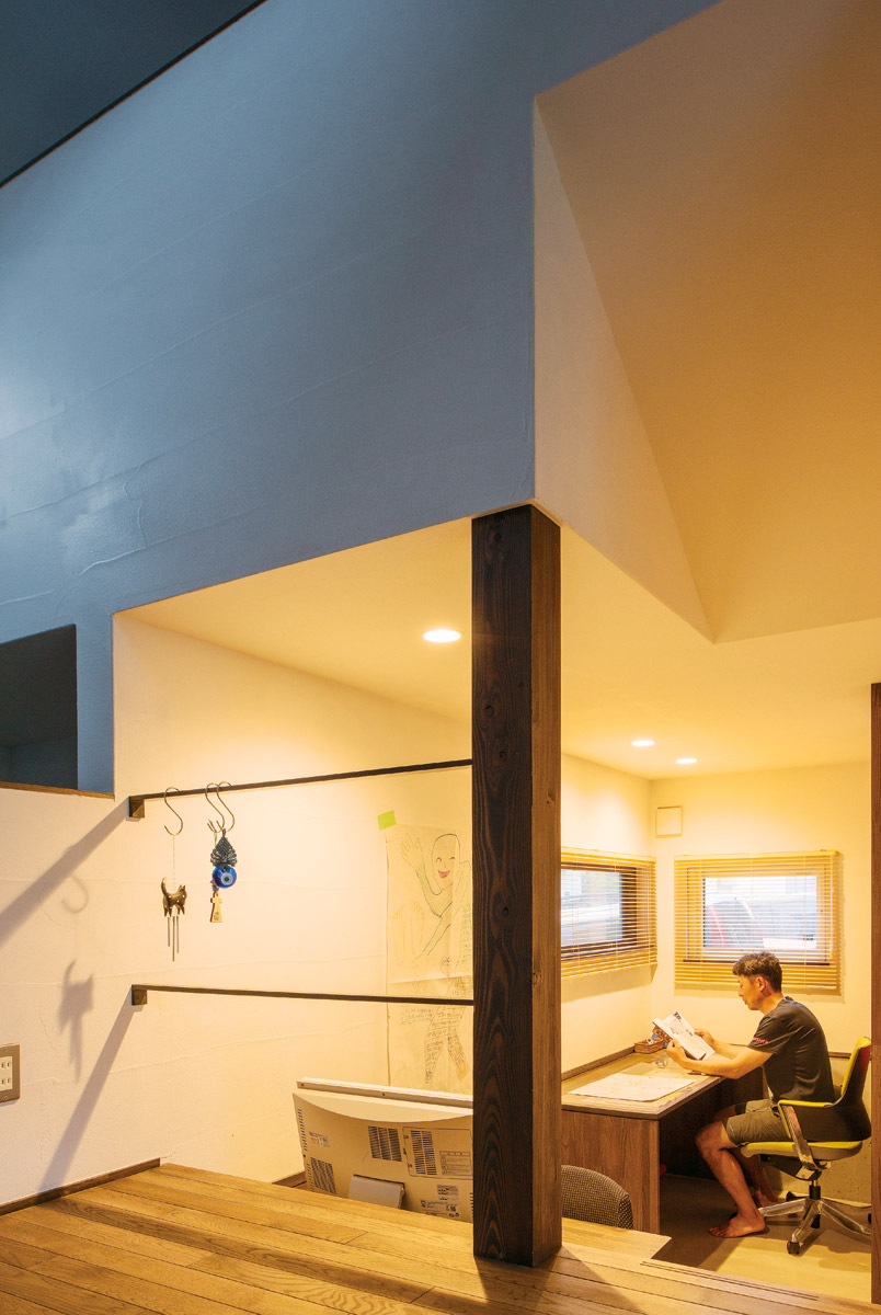 「数年前に近所で行われたSUDOホームの家の見学会に行き、夫婦ともにひと目惚れ。こんな家に住みたいと思い、将来建てるなら絶対にここでと考えていたんです」と語るYさん。念願叶って実家に隣接する土地に新築することが決まり、早速お願いすることに。道路からの高低差が90㎝という難しい土地条件でしたが、それを室内空間に巧みに活かしたスキップフロア構造の家が完成しました。