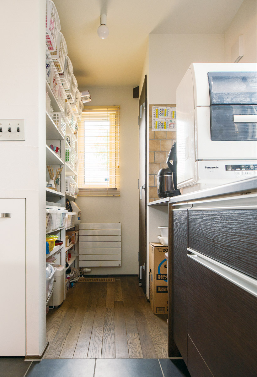 キャンプ用具の収納スペースや手持ちの家具に合わせた設計など、細かな部分まで緻密に計算され、空間に無駄がなくすっきり。隣接する実家の畑を借景にして、リビングには大きな一枚窓。屋根付きの広いテラスはBBQをしたり子どもの遊び場になったりと、家の一部として大活躍しています。