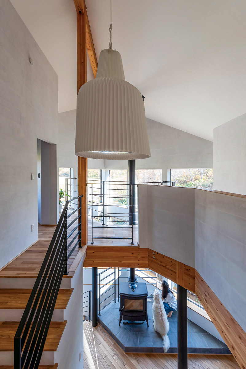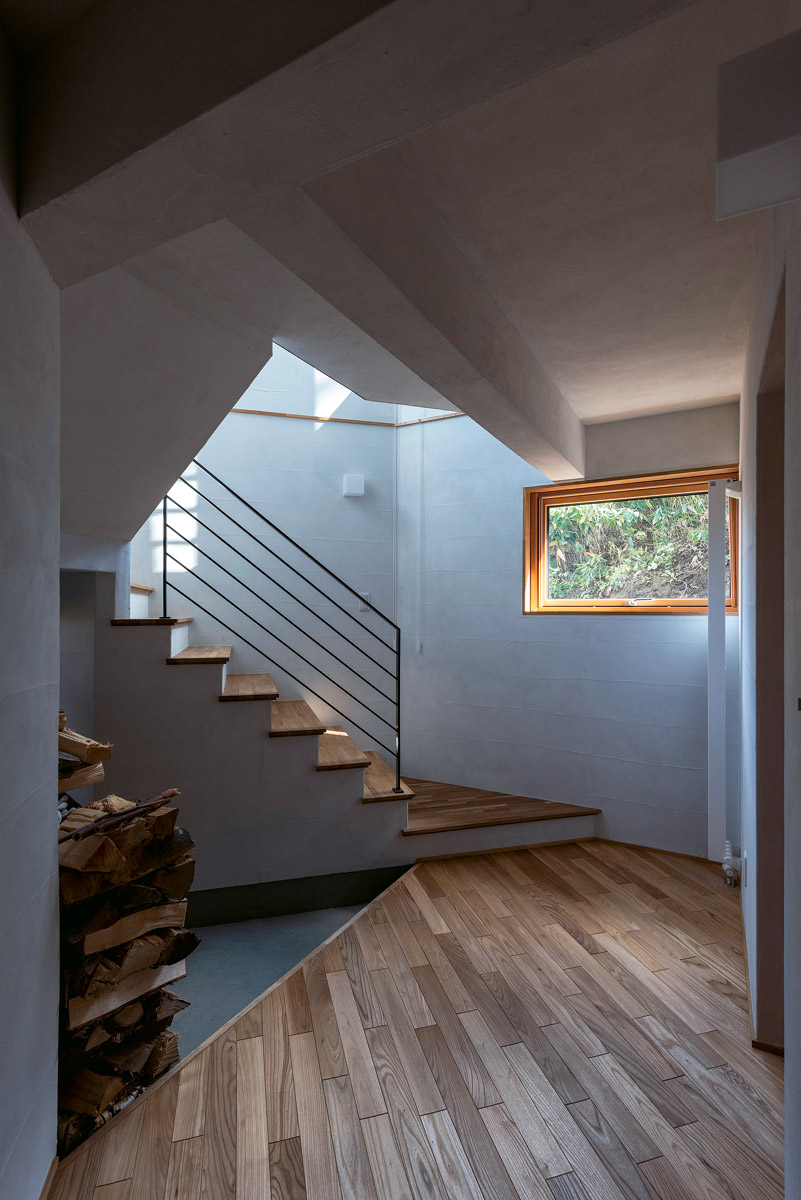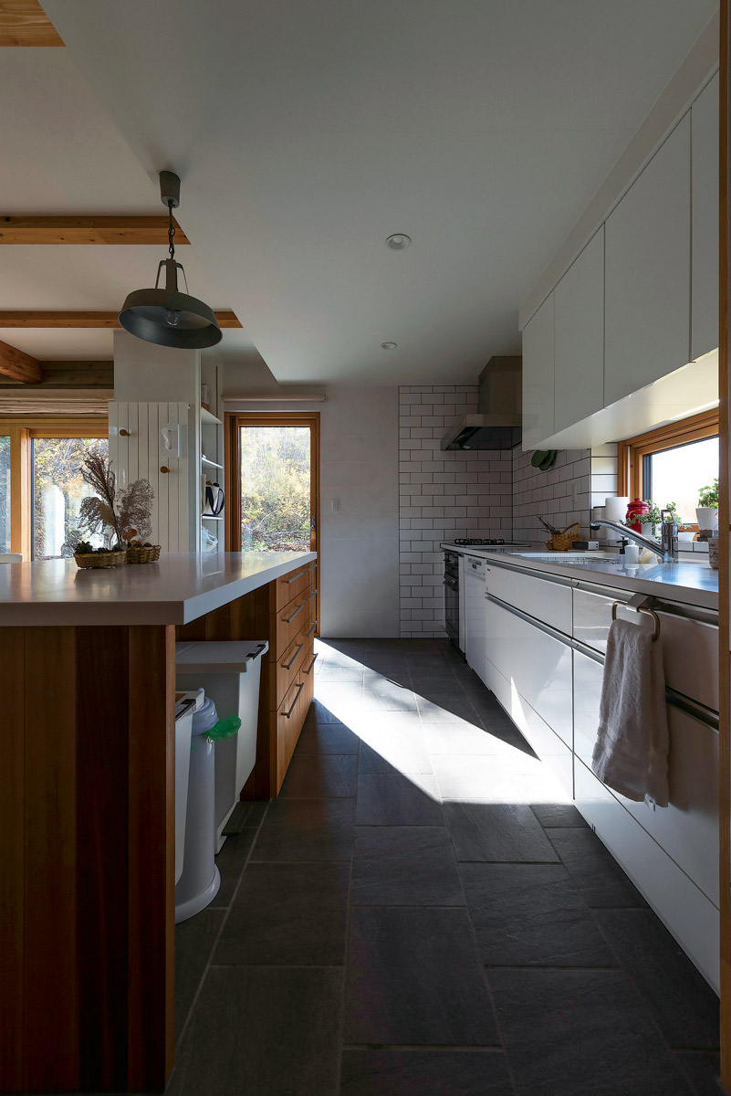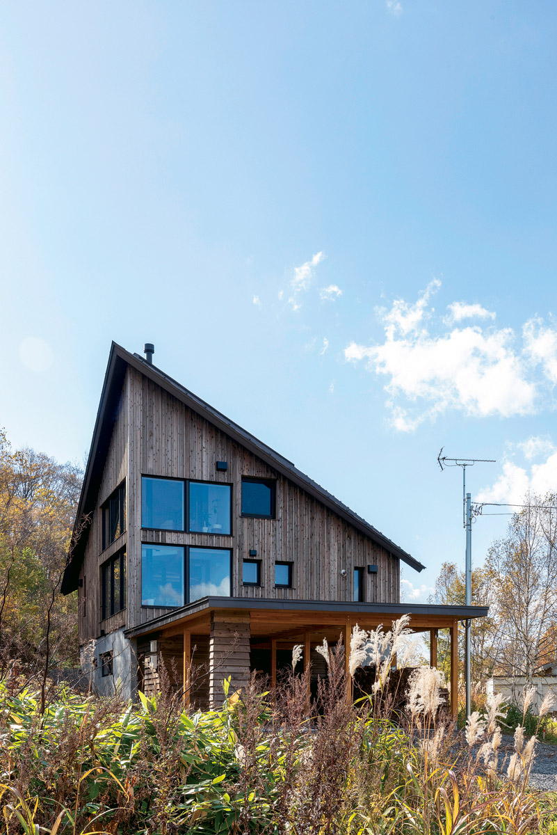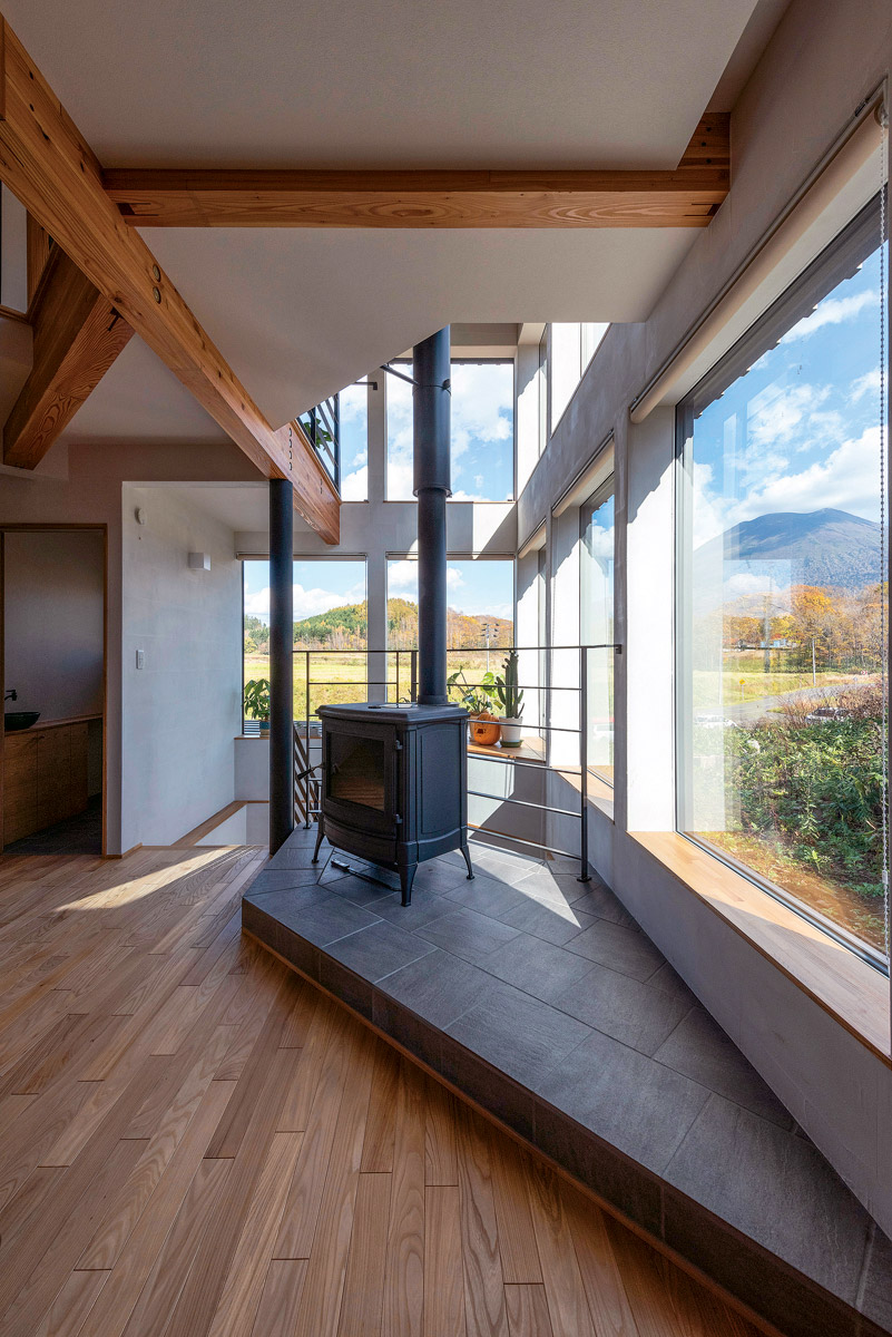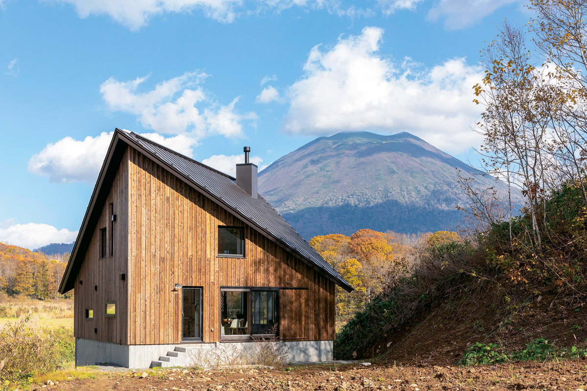 2、3年かけて羊蹄山の見える場所を探したというご夫妻。手に入れた580坪以上の広い土地を有効に使い、10枚の窓が並ぶ東側に据えられた大開口からは、まるで絵画を切り取ったように羊蹄山が美しく見えます。元々の傾斜を利用して、アプローチからも、LDKのあるフロアからも出入りが可能。15畳分ほどのアプローチには屋根を付けることで、公道までの除雪の距離を短くするとともに、雪や雨の日だけではなく、陽射しの強い季節にも使い勝手のよいスペースとなりました。