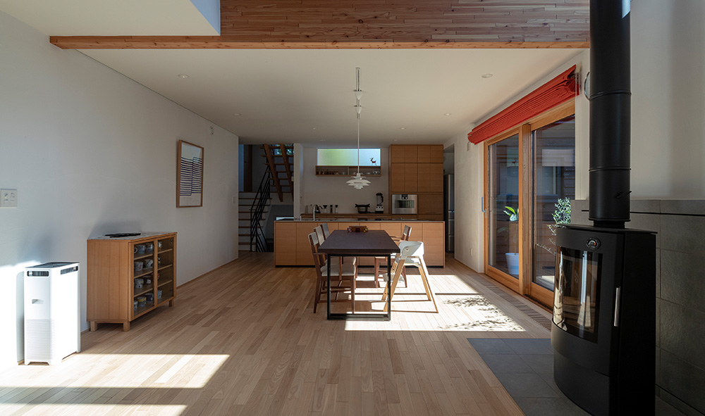 床/北海道産ニレ無垢材、壁/珪藻土入塗壁、天井/珪藻土入クロス