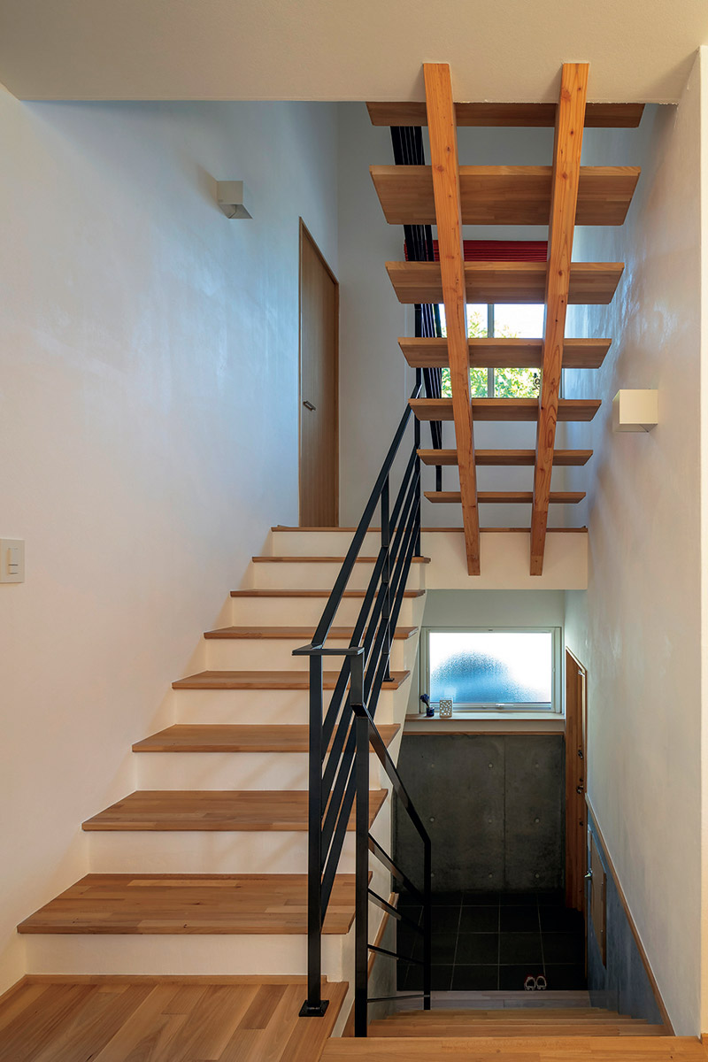 設計上の最大の難問だったのは、玄関から奥へ向けての土地の高低差。通常であれば、玄関自体を底上げするところですが、なんと玄関の上がり框からすぐ階段でLDKに上がるスキップフロア構造に。省スペースで空間効率もよい間取りとなりました。夫婦ふたりとも北欧スタイルが好きなことから、室内は無垢フローリングと漆喰の壁を使ったシンプルモダンな空間に、天然木の風合いが心地よい造作家具を随所にしつらえています。