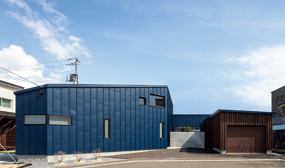 採光用の窓があるだけのガルバリウム鋼板に覆われたSさん宅。ロの字形の家、広いリビング、外からの視線が気にならない空間、というSさんの希望を実現するために、設計担当者は「こぶしを握って少し開いたような」形にしたと話します。