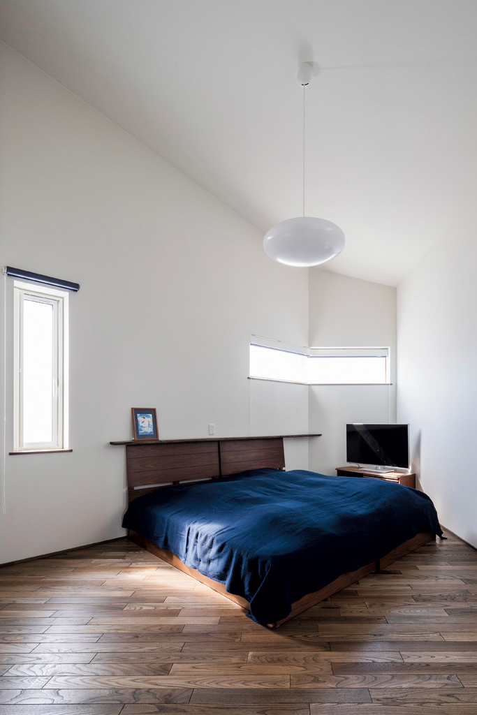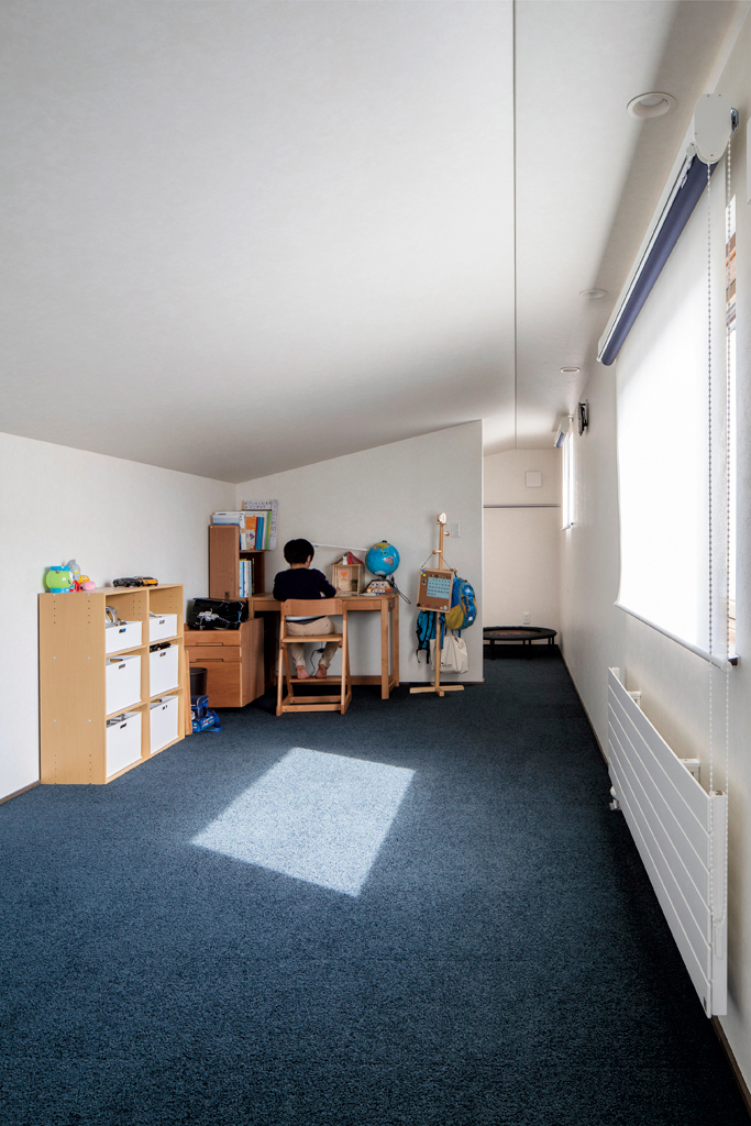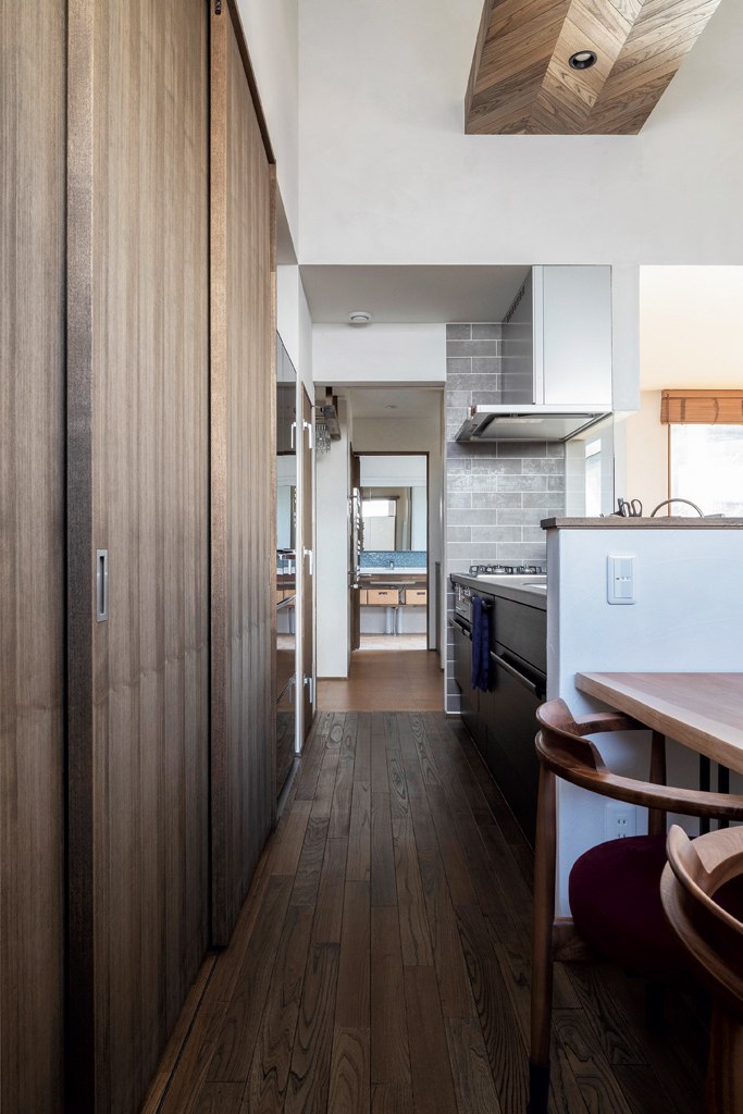 この「閉じられた家」の一番の特徴は28帖の広間。南向きの大きな木製サッシを通して中庭とつながっているので、視覚的にはそれ以上の開放感があります。キッチンから広間のソファへの動線は短く取り、家事動線も回遊式にまとめられているため移動距離が短くなり快適です。ヘリンボーン風に木を組み合わせたキッチンの天井や、道南スギでインナーデッキ風に設えた庭前の床などがこの広い空間を適度に引き締めています。