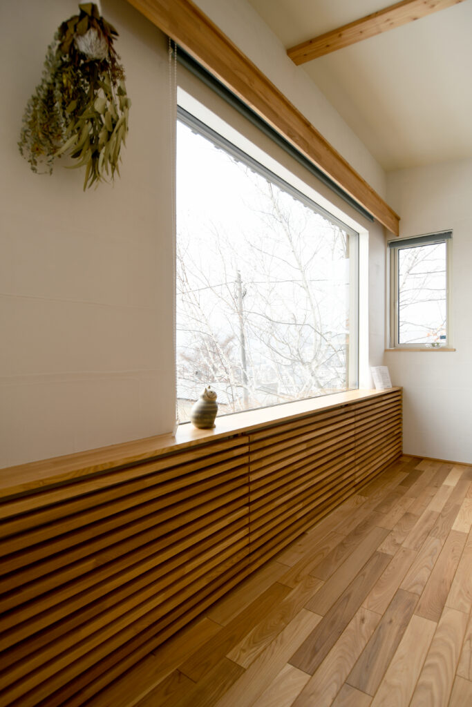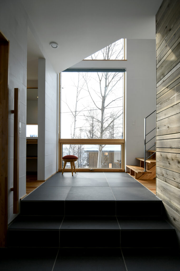 - 玄関ホールから大型窓越しに四季折々を感じる暮らし