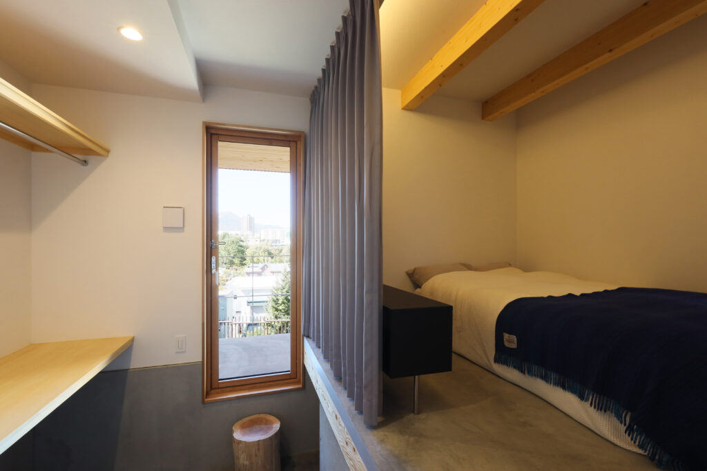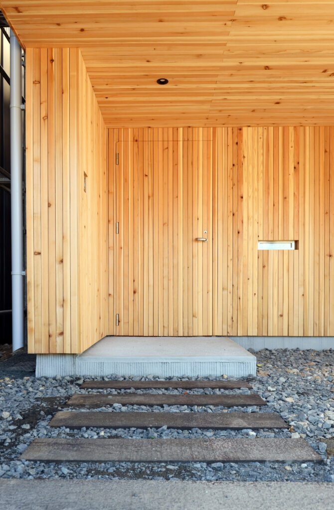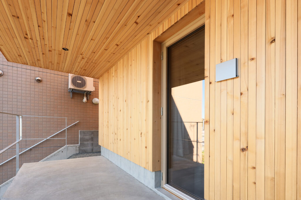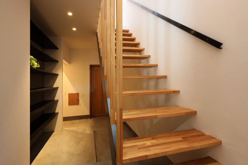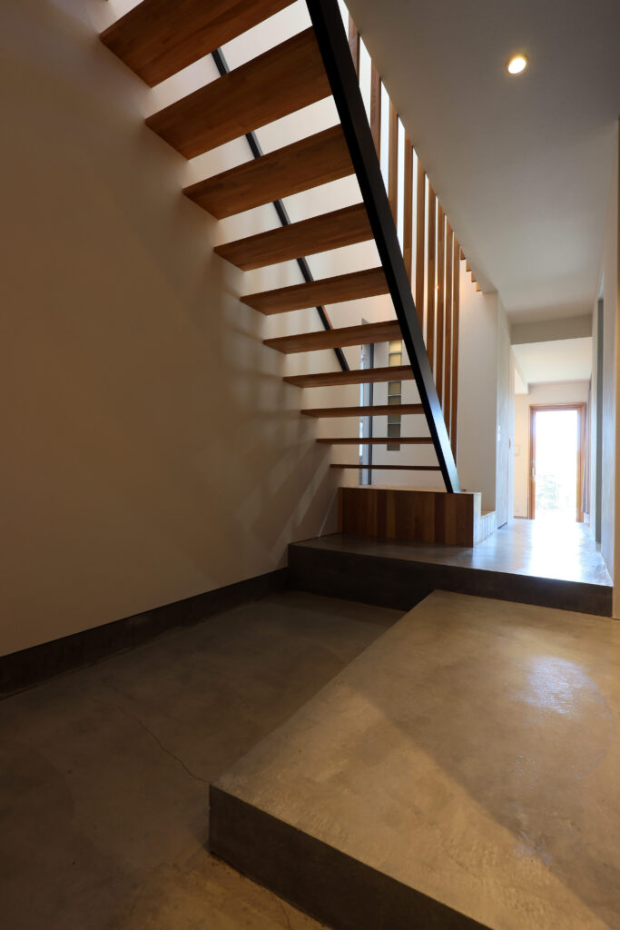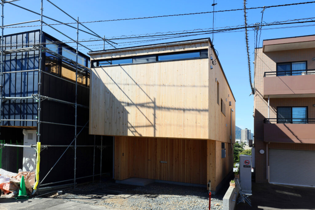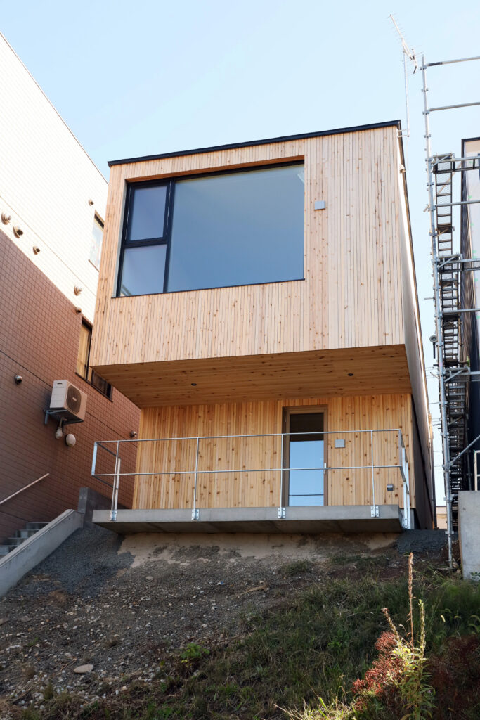 - 傾斜に跳ね出した2階リビングと1階テラスから景色を眺める暮らし